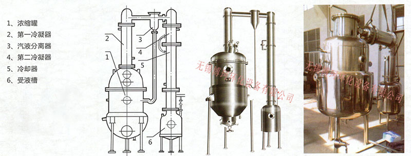 本設備主要包括濃縮罐、冷凝器、汽液分離器、冷卻器、受液桶六個部件組成,由不銹鋼制造。濃縮罐為夾套結構、冷凝器為列管式,冷卻器為盤管式。
